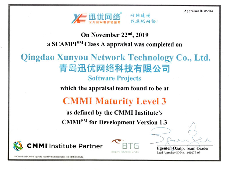 公司于2019年11月18日通過(guò)了CMMI等級(jí)認(rèn)證,認(rèn)定我司的軟件過(guò)程成熟度達(dá)到了三級(jí)的水平,取得了CMMI三級(jí)證書(shū)。