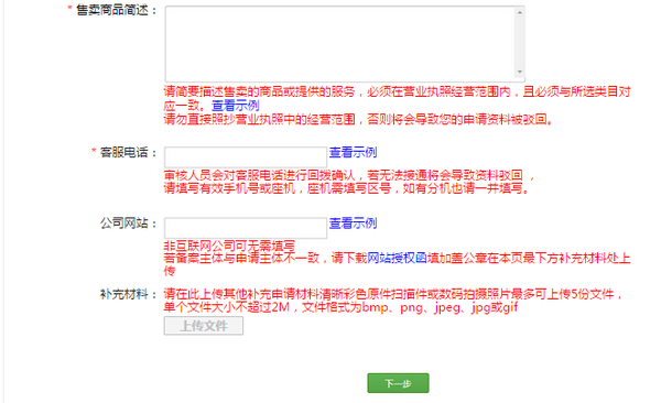 ②按照上面的提示填寫信息,*為必填,其他可以不填,特殊行業(yè)需要提供資質(zhì)證書(如食品、醫(yī)療等)