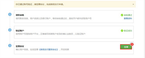 step6:登錄商戶平臺成功->賬戶設(shè)置->支付申請->簽署協(xié)議->簽署