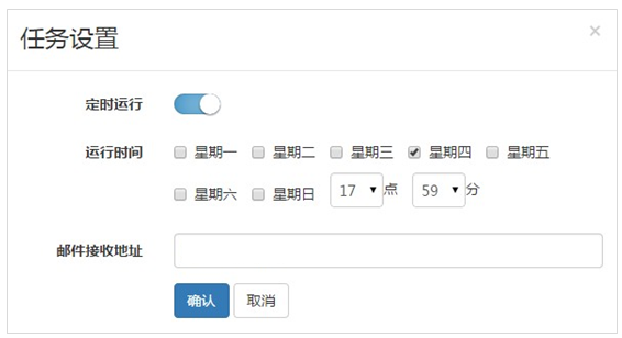 ”,設(shè)置掃描頻率、定時(shí)運(yùn)行時(shí)間和通知郵件接收地址,如下圖所示:
