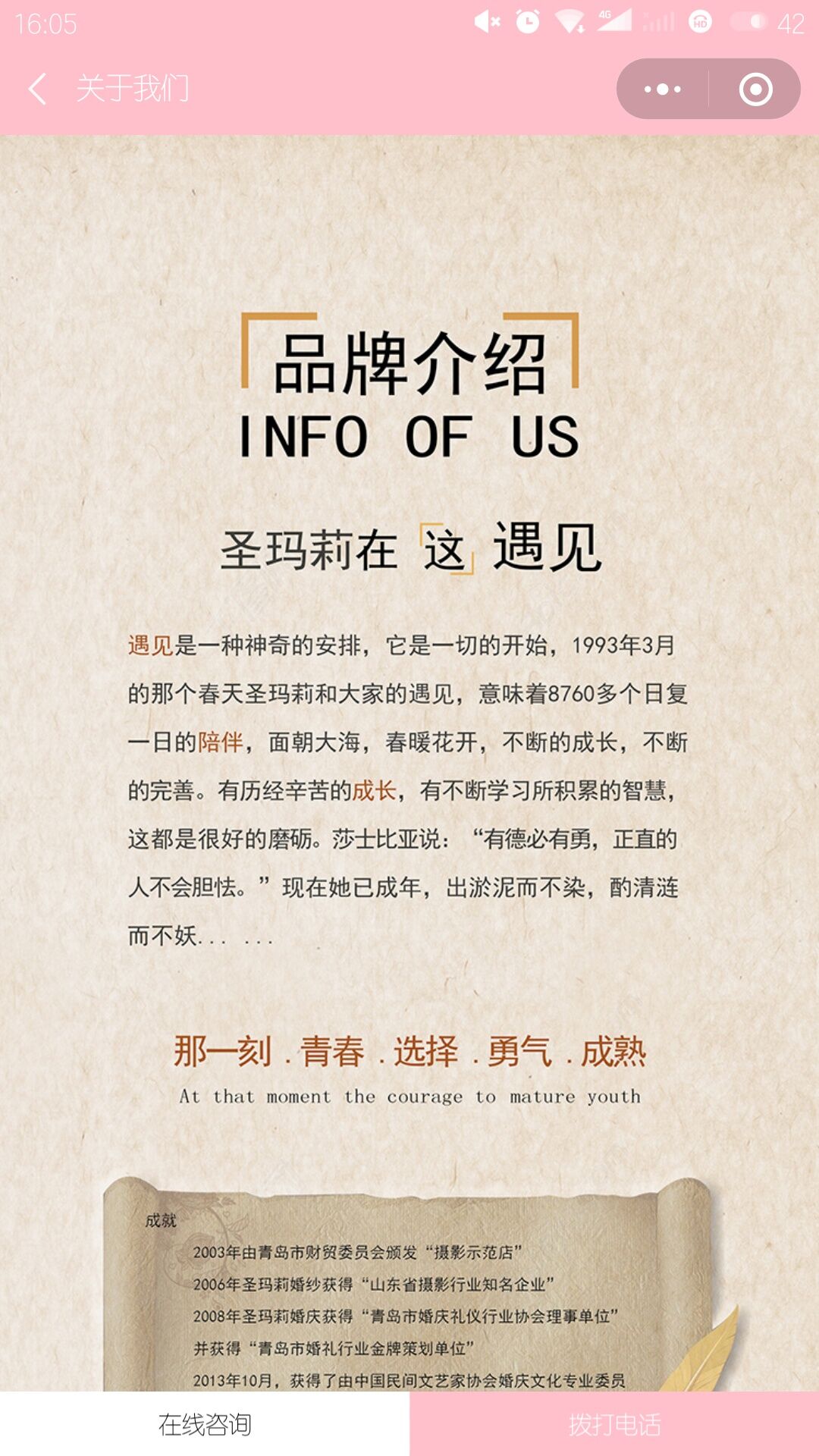 圣瑪莉婚紗攝影中心,主要經(jīng)營婚紗攝影;婚慶禮儀、慶典;彩擴;出租婚紗。(以上范圍需經(jīng)許可經(jīng)營的,須憑許可證經(jīng)營), 我們始終堅持用戶至上,用心服務(wù)于客戶,堅持用自己的服務(wù)去打動客戶,公司秉承“保證一流質(zhì)量,保持一級信譽”的經(jīng)營理念,堅持“客戶第一”的原則為廣大客戶提供優(yōu)質(zhì)的服務(wù)。歡迎來電洽談業(yè)務(wù)!?