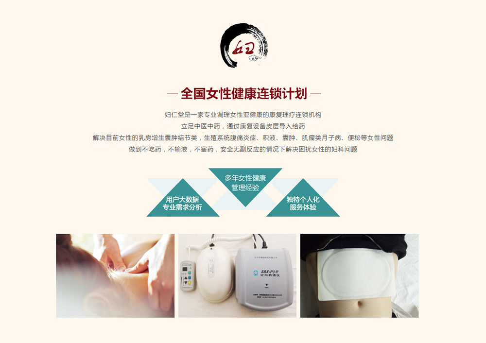 婦仁堂女性健康管理全國連鎖機(jī)構(gòu),結(jié)合先進(jìn)的透皮康復(fù)理療設(shè)備,運(yùn)用傳統(tǒng)中醫(yī)理論“內(nèi)病外調(diào)、透皮給藥、靶向治療”作為基礎(chǔ),是目前一家能夠做到不打針、不吃藥、不手術(shù)、不塞藥解決困擾女性反復(fù)發(fā)作的婦科問題的專業(yè)機(jī)構(gòu)。其安全、有效、快捷、方便等優(yōu)點(diǎn),更容易被廣大女性接受,為女性的健康護(hù)航。