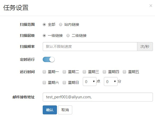 ”,設(shè)置掃描頻率、定時(shí)運(yùn)行時(shí)間和通知郵件接收地址,如下圖所示: