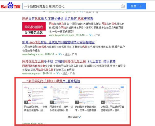 其實(shí)在國內(nèi),也并非完全沒有這種展示方式。假如搜索“一個新的網(wǎng)站怎么做SEO優(yōu)化”,百度的搜索結(jié)果頁面如下: